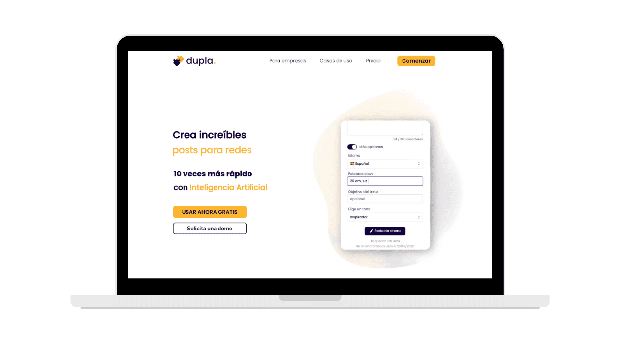 Crea posts para redes en minutos con Dupla.ai. Ahorra tiempo, mejora tu contenido y haz crecer tu negocio sin complicarte.