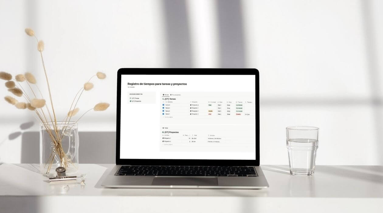 Controla tu tiempo por proyectos en Notion y comparte el progreso con tus clientas sin complicarte. Fácil, visual y en tiempo real.