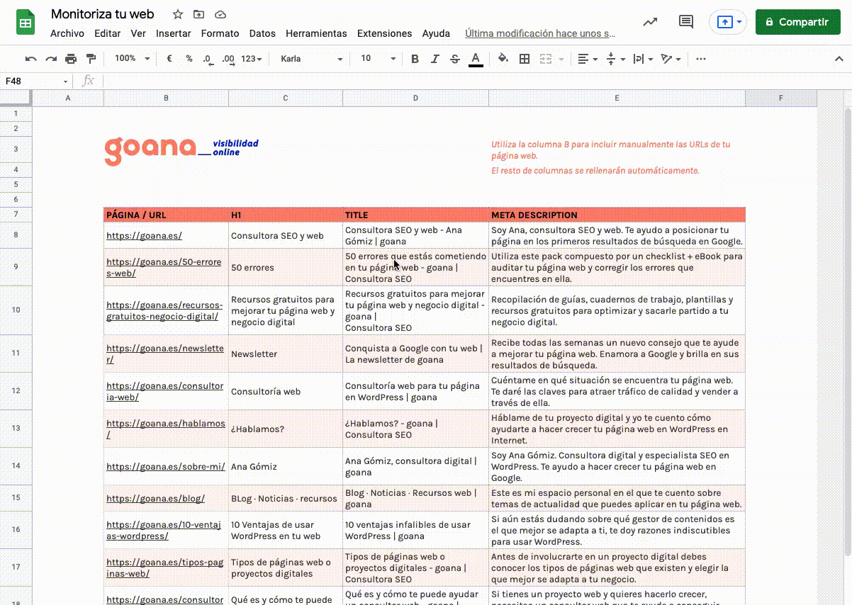 Así que te recomiendo que abras la hoja de cálculo que te regalé en el #SEOTIP monitoriza tu web con plantilla incluida y te crees una nueva columna destinada a PALABRAS CLAVE.